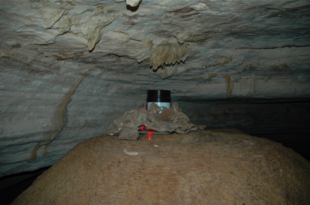 The units were placed on and in this cave last December and were recently checked this June. So far the surface unit has been triggered because of rain but no water has made it into the cave to trigger the inside unit. In fact, things are very dry in and around the cave. Similar experiments have been done in caves in Florida showing that rainwater takes 2.5 months to make its way through the limestone into the subsurface caves.