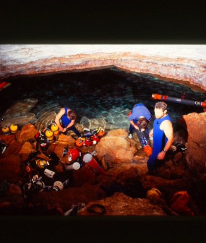 So basically, the story starts of at the site with Rob talking to the village elder, an Aboriginal man who was the leader of the a tribe that actually owned the land. The elder told Rob as he was standing next to the opening that, ‘today was not a good day to dive.’ Rob looked at him, looked at the stunning blue, cloudless sky above, looked back at him and asked, ‘why?’ The elder explained that he had observed some small animals leaving the entrance, indicating that something was going to happen today and it was not good. Respectfully Rob thanked him and everyone continued with the days plans. The floor of the opening is some 300 feet below the surface. Dropping your equipment down was not an option and being that there was so much equipment to be lowered, special rigs had to be set up, some attached to motor vehicles, especially the really heavy stuff. Needless to say, getting ready to dive at this site was a labour intensive exercise. This system is very extensive, requiring a large number of scuba bottles and for those few lucky ones that had scooters, that equipment needed to be lowered as well, carefully.
